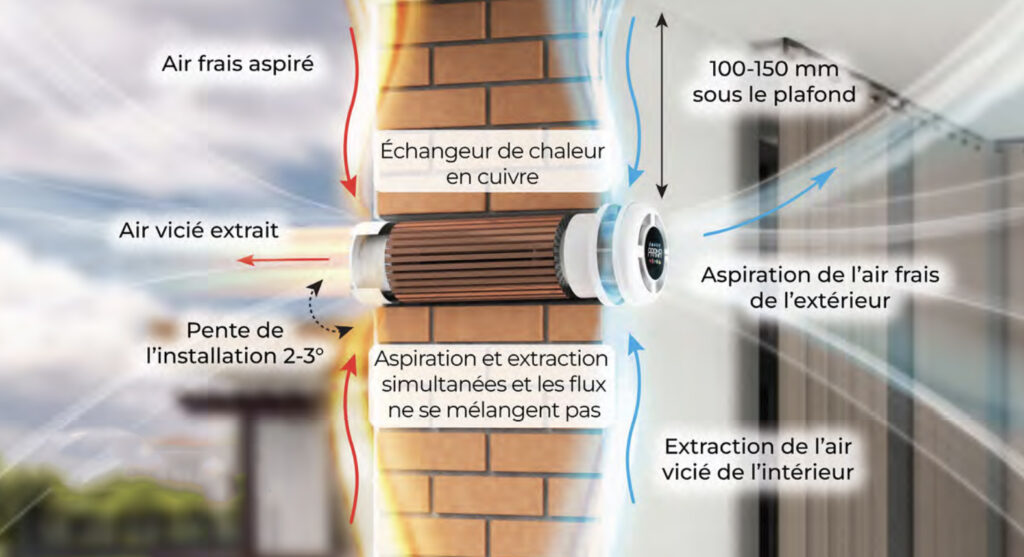 Le système récupère l’énergie de l’air sortant pour préchauffer ou rafraîchir l’air entrant, ce qui améliore considérablement l’efficacité thermique du bâtiment.